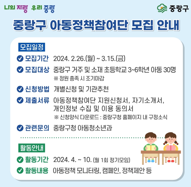 모집 대상은 중랑구에 거주하거나 중랑구 소재 학교에 재학 중인 초등학교 3~6학년 30명이다. 아동 권리와 정책에 관심이 많고, 성실히 활동할 수 있는 아동이라면 누구나 신청할 수 있다.
