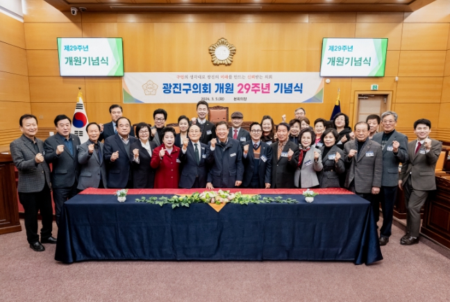 이날 진행된 개원기념식에서는 추윤구 의장을 비롯한 의원들과 김경호 광진구청장, 전직 구의원, 의회사무국 직원 등 80여명이 참석했으며 장길천 의회운영위원장의 사회로 국추윤구 의장 기념사, 김경호 구청장, 이창비, 박삼례 전 의장, 최복수 전 의정회장, 곽근수 의정부회장의 축사 순으로 진행됐다. 이어 개원 29주년을 기념하는 축하케이크 커팅식 및 신진호 부의장의 건배제의와 기념촬영을 끝으로 행사가 마무리됐다.