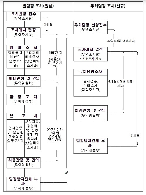 ![]() 반덤핑 조사(원심) 및 우회덤핑 조사 절차도 비교 |