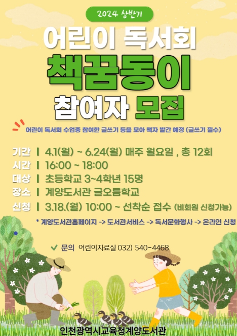 ![]() 인천광역시교육청계양도서관, 어린이 독서회 '책꿈동이' 참여자 모집 |