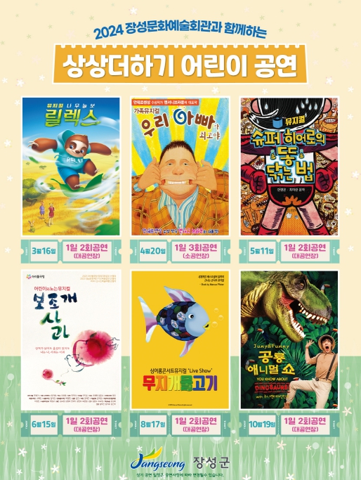 장성군 관계자는 “지난해 ‘상상 더하기’ 공연의 큰 호응에 힘입어 올해도 양질의 공연을 풍성하게 준비했다”며 많은 관람을 부탁했다.