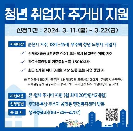 ![]() 순천시, 청년 취업자 주거비 연 최대 240만원 지원! |