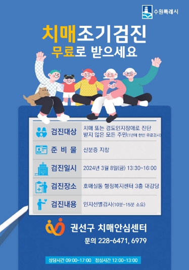 이번 출장 검진을 진행하는 권선구 치매안심센터는 매년 관내 경로당, 아파트 단지 등을 방문하여 치매검진을 실시하고 있으며, 최근에는 주민들의 접근성이 좋은 각 동 행정복지센터에서 신청받아 ‘행정복지센터로 찾아가는 출장 치매검진’을 진행하고 있다. 또한 10명 이상의 대상자가 있는 곳이라면 치매 출장 검진 신청이 가능하다.
