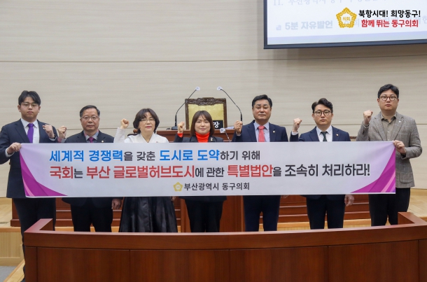 부산 동구의회는 결의문을 통해 “현재 부산은 수도권 집중화와 인구 감소로 인해 도시경쟁력이 약화되고 있으며, 이러한 상황에서 부산 글로벌허브도시 특별법은 부산을 남부권 중심축으로 성장시킬 기폭제 역할을 하게 될 것”이라 밝혔다.