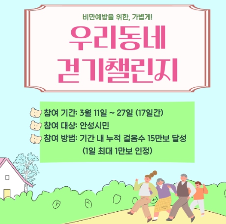 이번 챌린지는 안성시민을 대상으로 3월 11일부터 27일까지 17일 간 15만보 달성(1일 최대 1만 인정)을 목표로 진행되며 15만보 이상 달성한 참가자 전원에게 모바일 상품권 5,000원권을 증정한다.