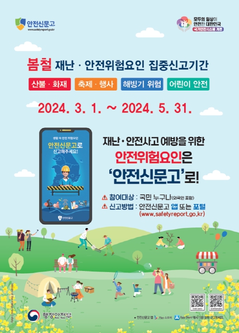 이번 봄철 집중 신고 대상은 산불·화재(불법 소각 등), 축제·행사(인파밀집 등), 해빙기 위험(붕괴, 낙석 등), 어린이 안전(통학로, 놀이시설 등) 관련 총 4가지 유형이며, ‘안전신문고’를 통해 신고를 접수하고 있다.