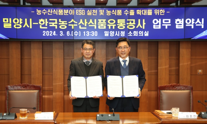 특히, 밀양시는 이번 협약을 통해 한국농수산식품유통공사와 농식품 수출 확대를 위한 다양한 방안을 모색하고 현지 시장 조사 및 마케팅 지원, 농식품 안전성 관리 등을 위한 협력사업을 추진할 예정이다.