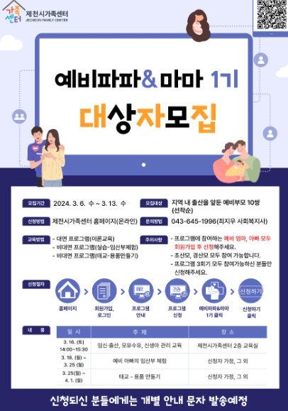 제천시가족센터 관계자는“지역 내 예비부모들이 필요로 하는 프로그램을 준비하여 임신과 출산으로 인한 부담을 줄이고 자녀 양육에 대한 자신감을 높여 부부가 함께하는 공동 육아에 대한 인식을 점차 확대시킬 수 있도록 노력하겠다.”고 전했다.