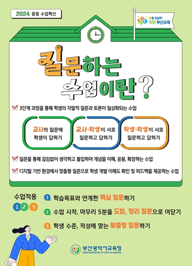 부산교육청이 수업 혁신의 하나로 추진하는 ‘질문하는 수업’은 ▲학생의 자발적 질문과 토론을 일상화한 수업 ▲교사-학생·학생-학생 간 질문을 통한 상호작용이 살아 있는 수업을 실현하기 위한 것이다.