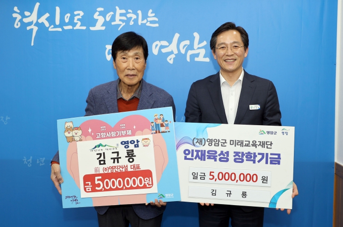 김 향우는 “내 고향 영암의 변화를 늘 응원해오고 있다. 이렇게 기부금으로 일조할 수 있어서 기쁘다. 지역발전과 영암 인재들을 위해 잘 쓰이길 바란다”고 전했다.