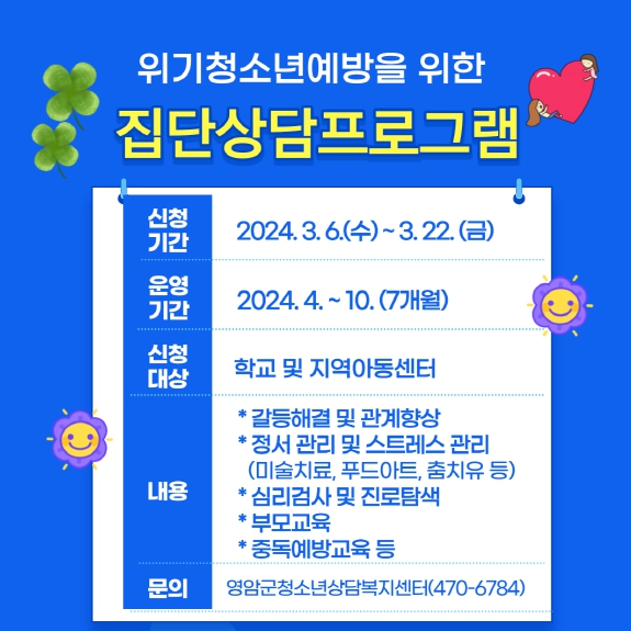 신청기간은 이달 6~22일이고, 프로그램에 대한 자세한 안내는 청소년상담복지센터에서 한다.
