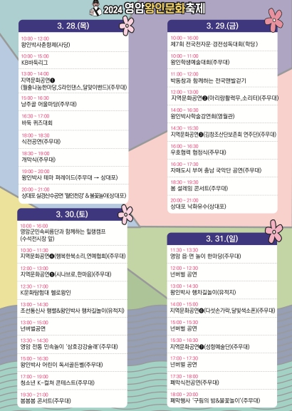 2024 영암왕인문화축제가 3월28일 개막한다. 영암군향토축제추진위원회에 따르면 오는 31일까지 ‘시공초월 : 왕인의 문화, 빛이 되다’을 주제로 나흘동안 왕인박사유적지에서 상대포와 구림마을 일원에서 펼쳐지고 “새로운 축제도시로서의 ‘빛’이나는 시작을 열다!”라는 컨셉으로 진행할 예정이다! 영암군과 영암문화관광재단은 24~25 대한민국 문화관광축제 및 24 전라남도 우수축제 선정 계기를 통해 최근 축제 트렌드에 맞는 프로그램을 반영하고 인물에서 인문으로 변화해가는 콘텐츠 축제로 변화하는 프로그램을 준비하고 있다.