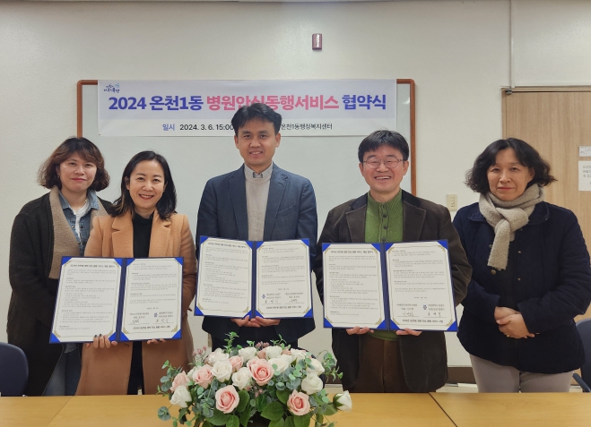 ![]() 6일 온천1동 행정복지센터에서 「병원 안심 동행 서비스」제공을 위해 제공기관과 협약을 체결하고 기념촬영을 하고 있다. |