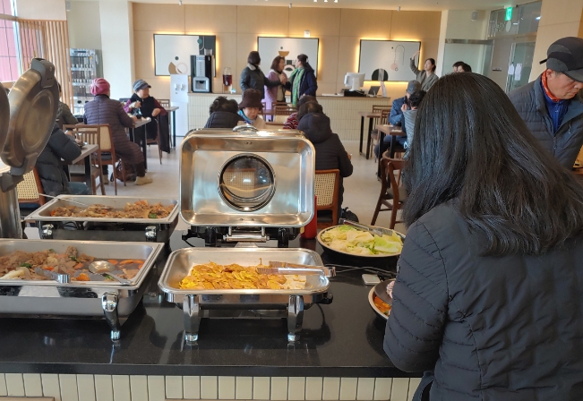 시계가 11시 30분을 가리키자, “입장하겠습니다”라는 말이 나왔다. 사람들은 기다렸다는 듯이 차례로 실내로 들어섰다. 갓 지어낸 밥과 따끈한 국과 스프가 김을 뿜어내는 쪽으로 발걸음을 재촉했다. 자리가 차서 식당 밖 대기 줄에서 잠시 기다려야 하는 이들은 아쉬운 표정을 지었다.