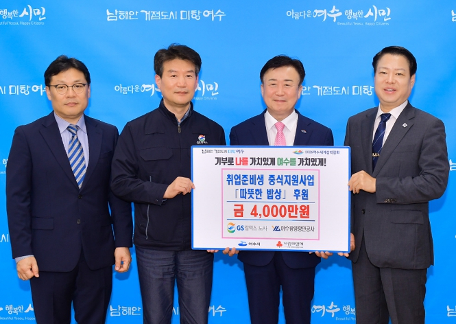여수시에 따르면 지난 13일 시장실에서 GS칼텍스 노사와 여수광양항만공사가 각각 2,000만 원을 기탁하는 전달식이 열렸다.