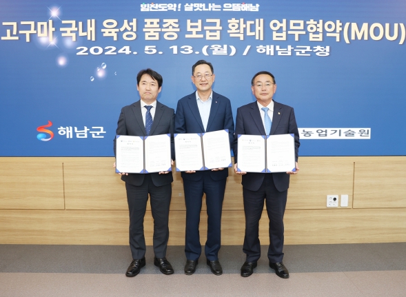 명현관 해남군수와 국립식량과학원 곽도연 원장, 전라남도농업기술원 박홍재 원장, 각 기관 관계자들이 참석한 가운데 열린 업무협약식에서는 해남고구마의 품질 경쟁력 향상을 위해 고구마 신품종의 품종 육성과 재배기술 개발 등에 유기적 협력체계를 구축해 나가기로 했다.