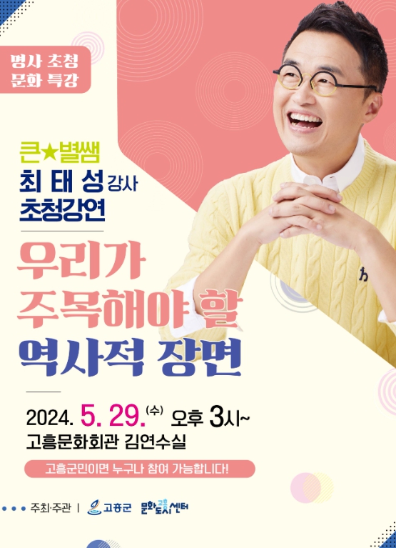 이번 특강은 한국사 일타강사로 꼽히는 ‘큰별쌤’ 최태성 강사를 초청해 ‘우리가 주목해야 할 역사적 장면’이라는 주제로 고흥의 역사와 문화적 가치, 역사가 우리에게 주는 의미 등에 대해서 강연한다.