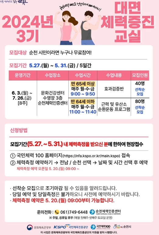 체력증진교실 모집 및 센터 이용 문의는 순천체력인증센터로 하면 된다.