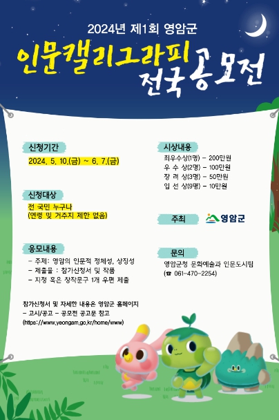 공모전은 ‘달빛생태문화도시 영암’ ‘마한의 숨결이 살아 숨쉬는 달빛도시 영암’ ‘진리가 샘물처럼 솟아나는 월출산 구정봉’ 등 지정 문구나 참여자의 창작 문구를 50×70cm 또는 70×50cm 크기의 종이에 손글씨로 자유롭게 표현한 캘리그라피 작품 1점과 참가신청서를 우편 제출하는 방식으로 참가할 수 있다.
