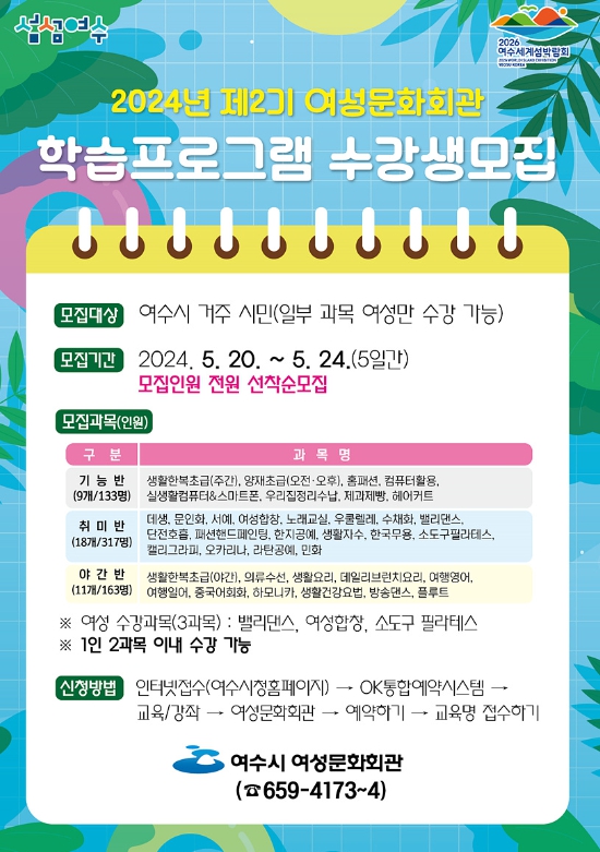 ![]() 여수시 여성문화회관에서 6~9월까지 진행하는 ‘제2기 여성문화회관 학습프로그램’ 수강생을 524명을 모집한다. |