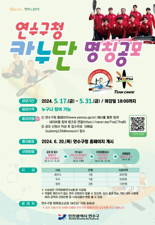 구는 자체 심사를 통해 연수구청 카누단을 대표하는 명칭으로서 적합성, 창의성, 전달성 등을 종합 평가해 응모된 명칭 중 5개 이내로 1차 선정하고, 이후 주민 선호도 투표를 거쳐 6월 20일 최종작을 선정해 누리집에 공개할 계획이다.