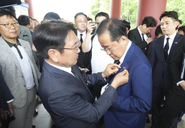 ![]() 강기정 광주광역시장이 제44주년 5·18민주화운동 기념식을 하루 앞둔 17일 오전 북구 운정동 국립5·18민주묘지를 찾은 홍준표 대구광역시장에게 5·18 배지를 달아주고 있다./광주광역시 제공 |