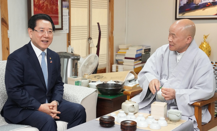 ![]() 김영록 전라남도지사가 18일 오후 ‘산사, 한국의 산지승원’ 세계유산인 태고총림 순천 선암사를 방문, 승범 주지스님과 차담을 하고, 불교문화 유산의 체계적 관리 방안을 논의하고 있다. |