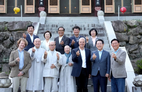 ![]() 김영록 전라남도지사가 19일 오후 장성 백양사에서 사찰음식과 문화자원을 세계에 알리기 열린 정관스님과 함께하는 ‘미국 유명 쉐프 에릭 리퍼트’ 초청 공양행사에서 김한종 장성군수, 정관스님과 에릭 리퍼트 등 참석자들과 기념촬영을 하고 있다. |