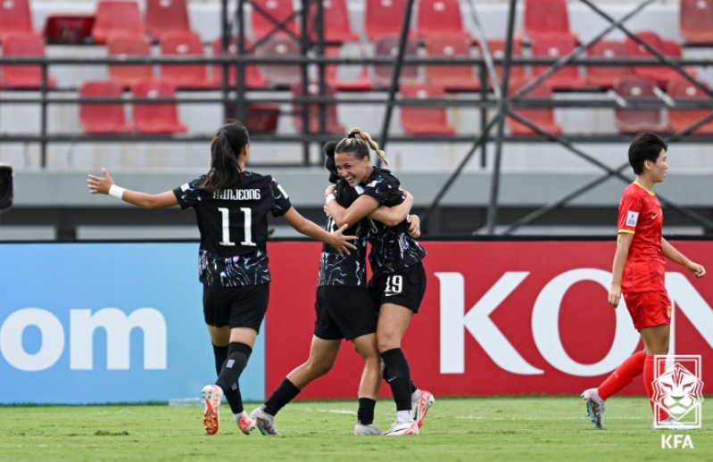 초반부터 중국을 강하게 몰아친 한국은 전반 12분 범예주의 슈팅이 골포스트를 강타하며 분위기를 가져왔다. 선제골은 골대를 맞춘 후 1분 만에 터져 나왔다. 강한 전방 압박을 통해 상대 진영에서 볼을 빼앗아낸 한국은 케이시가 원주은의 패스를 논스톱 슈팅으로 연결해 골망을 갈랐다. 케이시의 이번 대회 첫 골이 가장 중요한 순간에 터진 것이다.