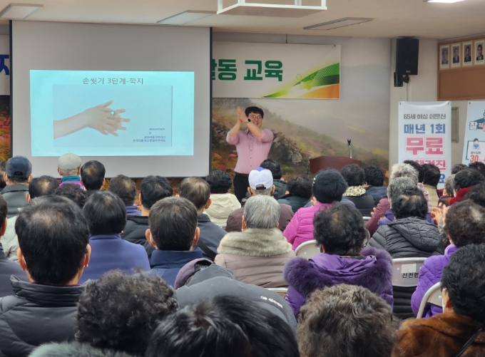 ![]() 지난 2월 신전면사무소에서 어르신을 대상으로 감염병 예방 교육을 하고 있다. |