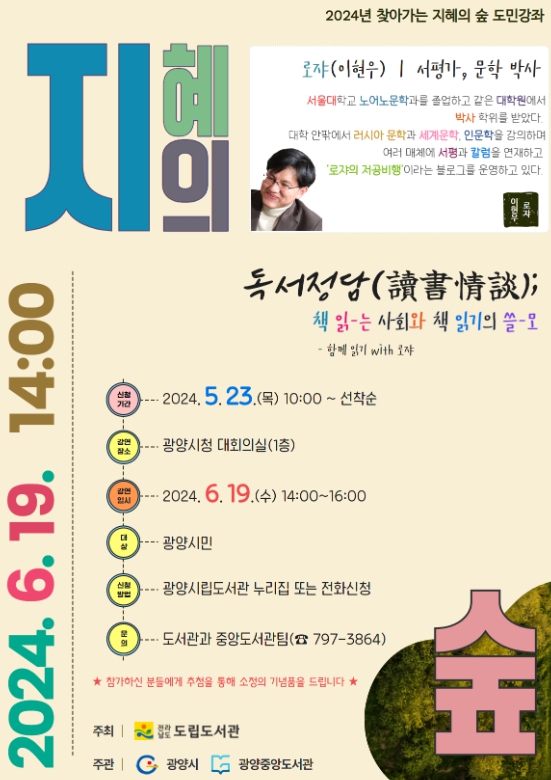 올해는 ‘독서정담(讀書情談); 책 읽는 사회와 책 읽기의 쓸모’를 주제로 광양시민과 함께 즐기는 인문학 강연으로 진행된다.