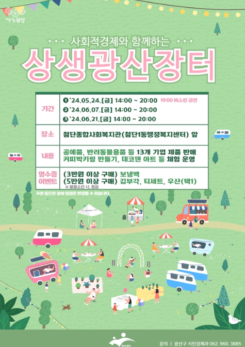 광산구 관계자는 “사회적경제, 소상공인 등 다양한 경제주체가 참여하는 상생광산장터가 지역경제 활성화의 마중물이 되길 기대한다”며 “많은 시민의 관심과 참여를 바란다”고 말했다.
