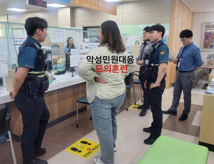 이날 모의훈련은 여권민원창구 악성민원 상황 설정으로 여권발급 접수·처리과정에서 민원인 위법행위 비상상황을 가정한 상황극으로, 관할 경찰서와 합동으로 진행됐다.