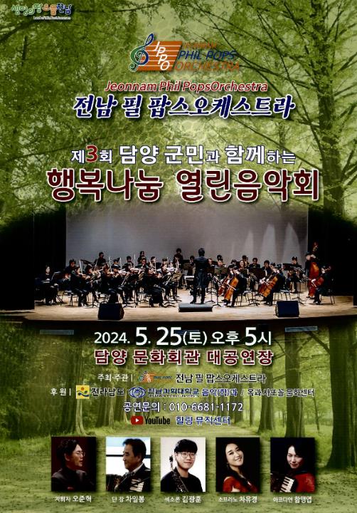 전남 필 팝스오케스트라는 지난 2월 순천문화예술회관 공연을 시작으로 전남 지역민들에게 음악의 힘으로 위안과 힐링의 시간을 제공하고자 전남권 순회공연을 진행하고 있으며, 이번 공연은 담양군민과 함께하는 행복 나눔 테마로 다양한 곡들을 공연할 예정이다.