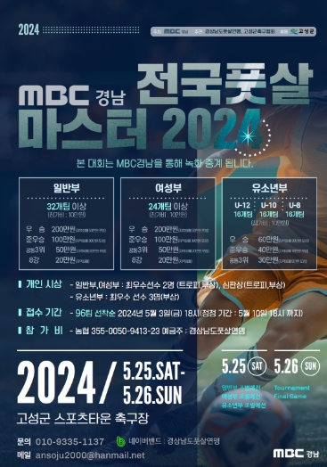 이번 대회는 MBC경남(대표이사 이우환)이 주최하고 경상남도풋살연맹(회장 백승대)·고성군축구협회(회장 배기완)가 공동 주관하며, △일반부 25팀 △여성부 28팀 △U-12 16팀 △U-10 16팀 △U-8 8팀 총 93개 팀이 참가한다.