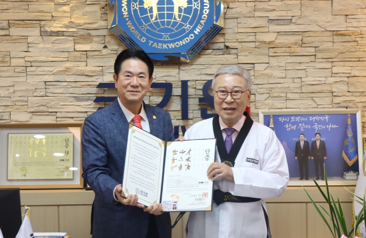 ![]() 이동섭 국기원장(왼쪽)이 김창준 前 미국 연방하원의원(오른쪽)에게 명예 7단증을 수여하고 기념사진을 촬영하는 모습 |