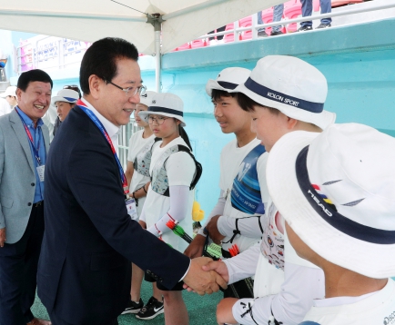![]() 김영록 전라남도지사가 26일 오전 제53회 전국소년체전 양궁경기가 열리고 있는 순천팔마종합운동장을 방문, 양궁 종목에 참가하고 있는 전남 선수단을 격려하고 있다. |