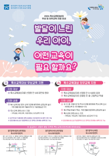 자료에는 ▲특수교육대상자 영아 무상교육 지원 절차 ▲특수교육대상자 유・초・중등 의무교육지원 절차 ▲2024학년도 유・초・중・고 입학 예정 학생 대상 특수교육대상자 선정·배치 안내 ▲자주 묻는 질문 ▲특수교육지원센터 위치 안내 등을 포함하고 있다.