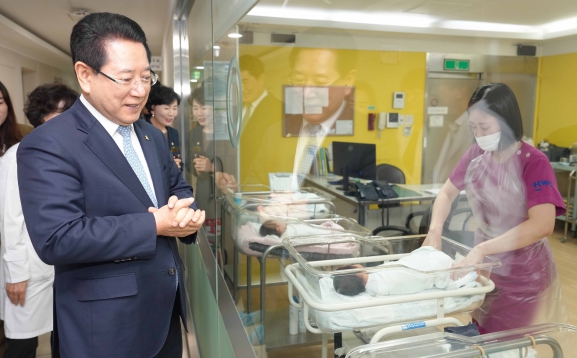 ![]() 김영록 전라남도지사가 27일 순천시 현대여성아동병원에서 개원한 ‘전남공공산후조리원 5호점’ 신생아실을 둘러보고 있다. |