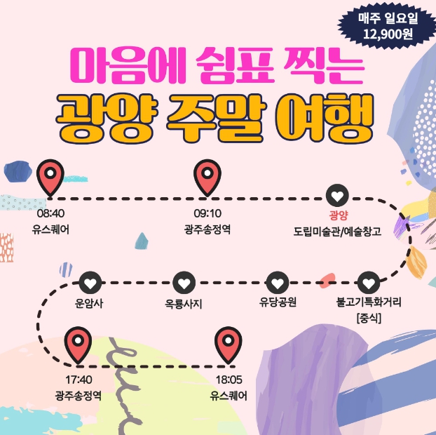 이어 서천변 광양불고기특화거리에서 점심을 즐긴 후 유당공원, 옥룡사지, 운암사 등에서 고요하고 편안한 주말 오후를 즐기고 유스퀘어(18시 5분)에 도착하는 코스이다.