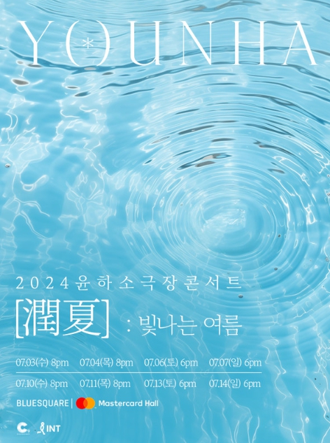 윤하의 2024 소극장 단독 콘서트 '潤夏 : 빛나는 여름'은 7월 3·4일 오후 8시, 6·7일 오후 6시, 10·11일 오후 8시, 13·14일 오후 6시에 블루스퀘어 마스터카드홀에서 열린다.
