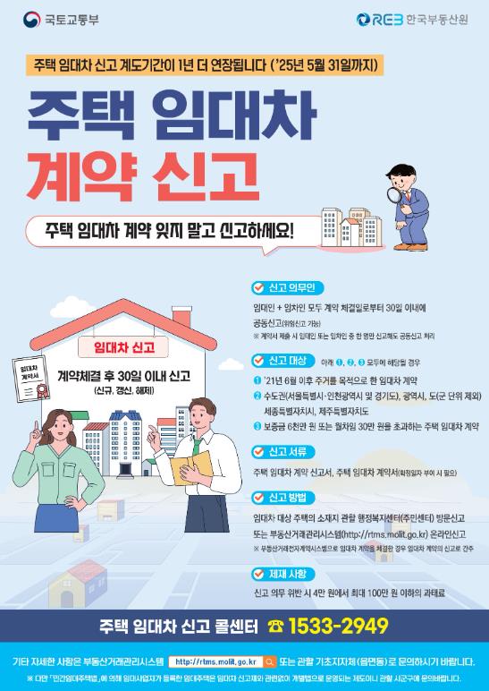 박종태 민원지적과장은 “계도기간이 연장됨에 따라 과태료 부과 대상이 아니더라도 계약일로부터 30일 이내 신고 의무는 유지된다”며 “임대차 신고는 주택 소재지 읍면동사무소를 방문하거나 온라인(부동산거래관리시스템)으로 가능하니 적극적인 신고를 당부드린다”고 말했다.