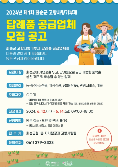 ![]() 제1차 화순군 고향사랑기부제 답례품 공급업체 모집 포스터 |