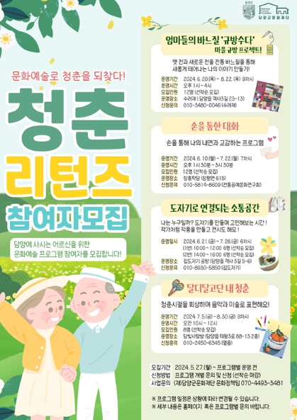 담양군문화재단은 지난 4월 ‘문화와 예술로 청춘을 되찾다’라는 주제로 시니어가 공감할 수 있는 소재와 대상의 특징을 담은 맞춤형 문화예술 프로그램을 공모해 지역 문화예술 단체 4곳을 선정했으며, 다채로운 프로그램을 통해 노년층의 참여를 독려하고 사회적 고립감을 해소하고자 한다.