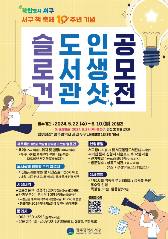 이번 공모전은 슬로건 공모와 도서관 인생샷 공모로 나뉘어 진행된다. 슬로건 공모는 책축제의 가치와 역할을 담은 15자 이내의 간결하고 함축적인 표어를 접수받고, 인생샷 공모는 서구 관내 도서관에서 행사․독서․도서관 전경 등을 찍은 추억사진을 뽑는다.