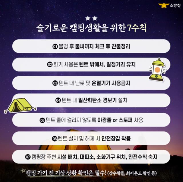 이에 캠핑장 화재 및 각종 사고 예방을 위한 안전 수칙으로는 첫째, 텐트와 화기는 충분한 안전거리 두고, 휴대용 가스버너를 넘어선 과대 불판은 절대 사용을 금지해야 한다.