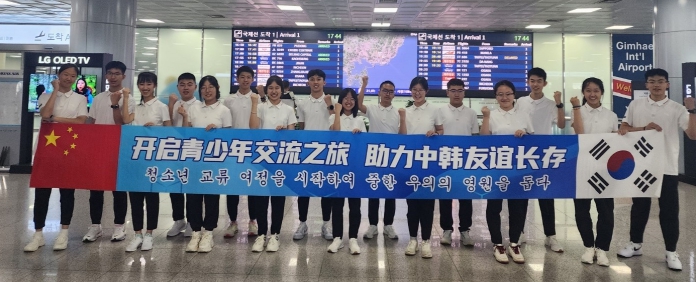 ![]() 중국 학생들이 28일 입국하면서 한중 청소년 교류 메시지를 펼쳐든 채 기념사진을 찍고 있다. |