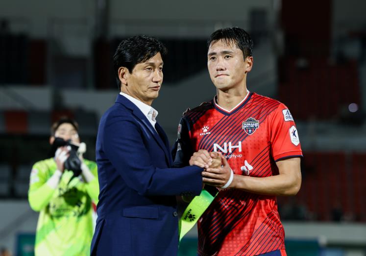![]() 지난 28일 서울전에서 김천상무 정정용 감독과 원두재가 경기 후 인사를 나누고 있다 |