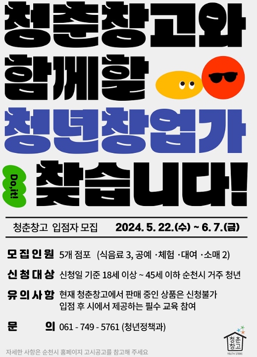 ![]() 청춘창고 5개 점포 청년창업자 모집 |
