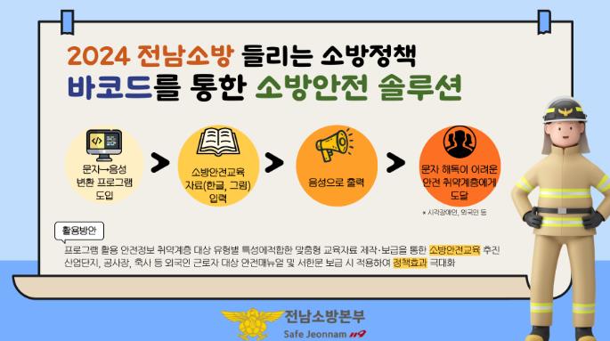 소방서는 음성변환바코드를 통한 안전교육 자료를 제작하여 배부하였으며, 음성변환바코드를 통한 안전교육은 목포 관내 외국인 밀집장소, 시각장애인센터 등을 순회하며 연중 실시할 예정이다.